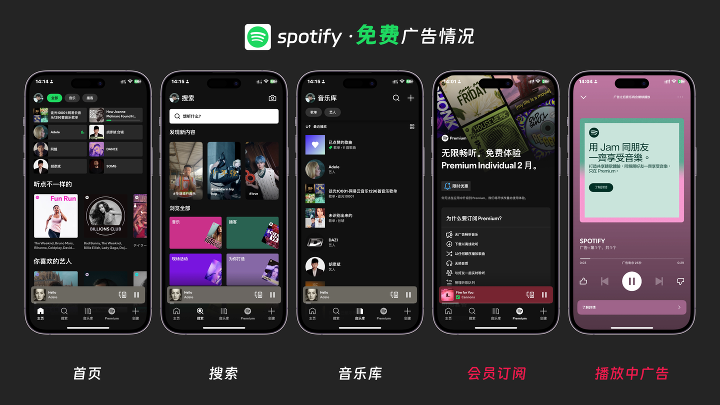 | Spotify Free(免费用户) | ✅ 有广告 | Spotify 通过广告收入支撑免费服务 |