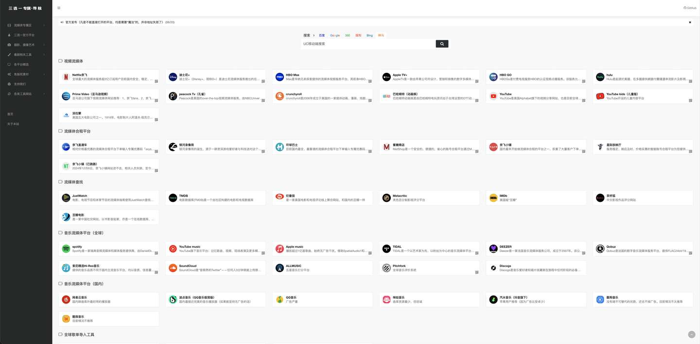 这是一个无广告,收集积累各类优质选择的格局集合网站,譬如免版权的音乐平台,格式转换、Spotify歌单转换等 还有看剧流媒体、等一系列境外的网站,并有相关解释