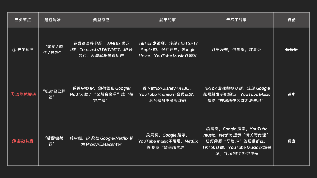住宅原生IP节点就是你家里真实的宽带,也是所有节点中成本最高的,没有特别需求其实没必要,但第三种基础转发无法流媒体解锁,可以理解为这个节点买了只能做基础的事情,但是价格便宜,在上传、下载的时候可以用,不心疼,第二种节点也是目前市面上最主流的节点,价格适中。